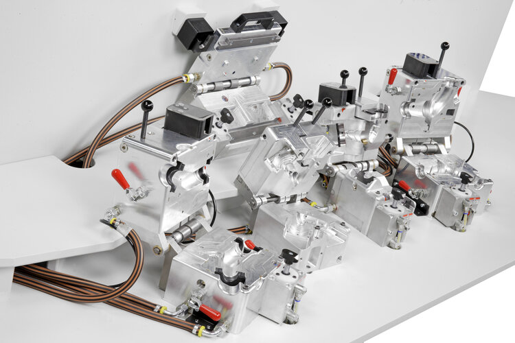 Die Schäumwerkzeuge und ihre Bewegungseinheiten eignen sich aufgrund der flexiblen Ausstattungs-möglichkeiten hervorragend für die unterschiedlichsten Kabelbaum - Bauteile in der Automobilindustrie. Die Werkzeuge und ihre Bewegungseinheit können sowohl in Standformtechnik als auch auf Rundtischen betrieben werden. Ein schneller Werkzeugwechsel ist ebenfalls möglich. |