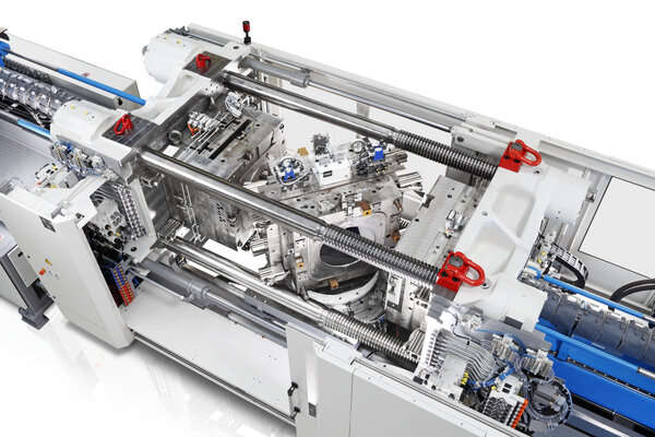 Die Maschine verfügt über zwei Trennebenen, sodass zwei Werkzeuge hintereinander eingespannt werden können. Dadurch entstehen zwei Austräge: eine Trennebene für den Vorformling und eine zweite Trennebene für die zweite Komponente. Der große Vorteil liegt im gleichzeitigen Einspritzen beider Komponenten, was einen doppelten Ausstoß bei gleicher Schließkraft im Vergleich zur Drehtischtechnik ermöglicht