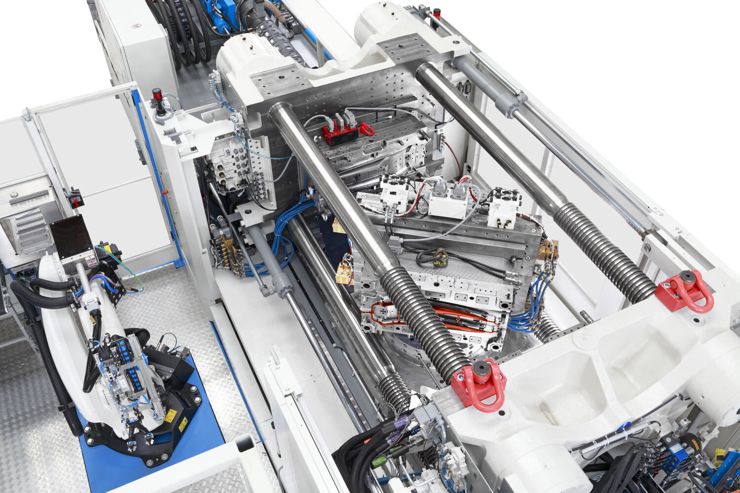 The machine has two parting lines, allowing two molds to be clamped one behind the other. This creates two outlets: one parting line for the preform and a second parting line for the second component. The major advantage lies in the simultaneous injection of both components, which enables double output with the same clamping force compared to rotary table technology.