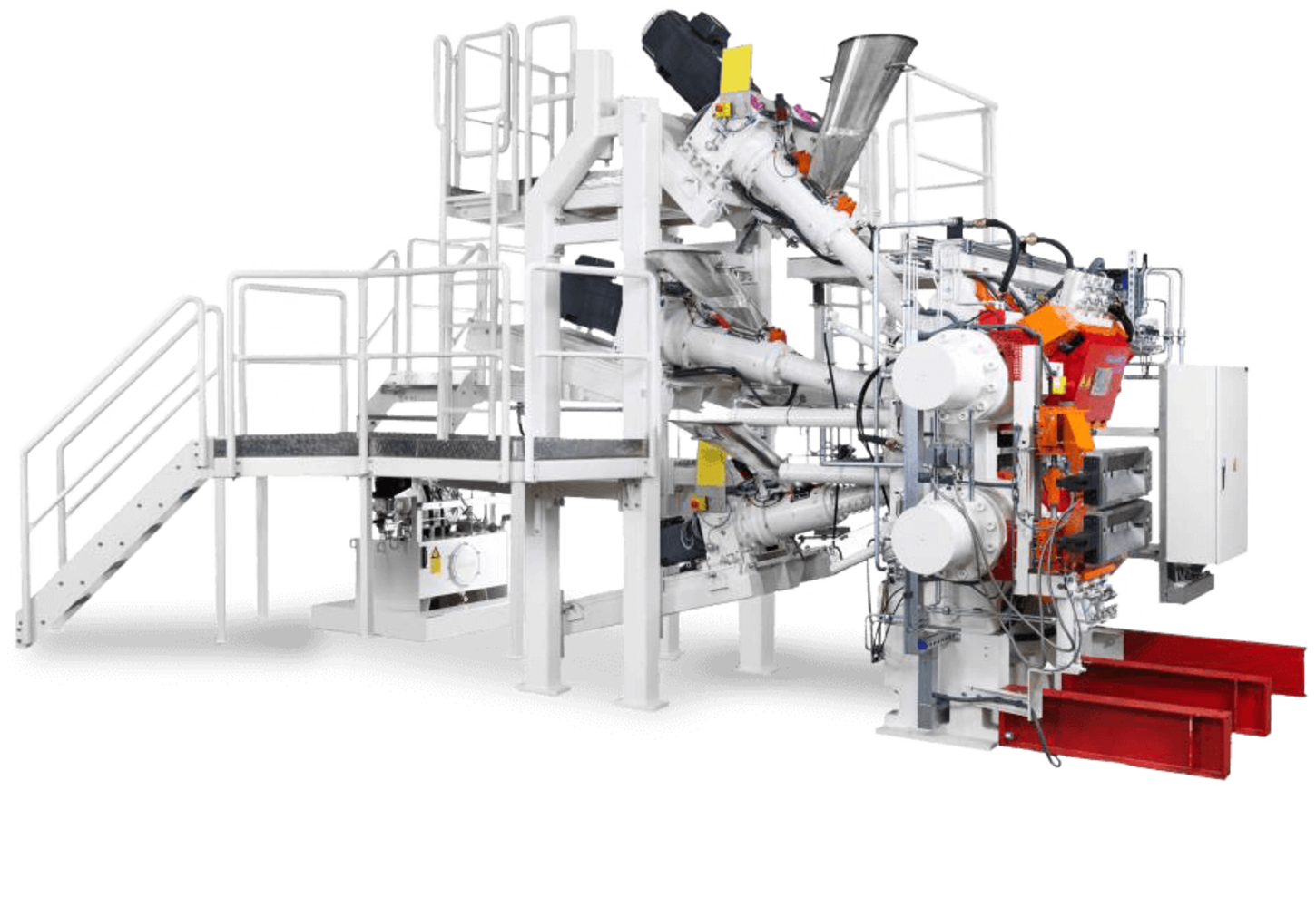 KraussMaffei Extrusion offers a modular design, the system configuration can be easily adapted to the desired profile cross-sections as a duplex, triplex, quadro, quinto, or hexaplex unit.