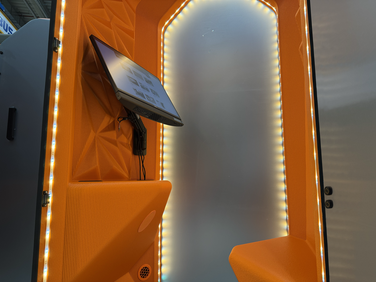 The KraussMaffei LearningPod is a flexible, extremely mobile (learning) booth that can be easily integrated into production environments and enables seamless interaction with existing digital learning management systems or intranets.