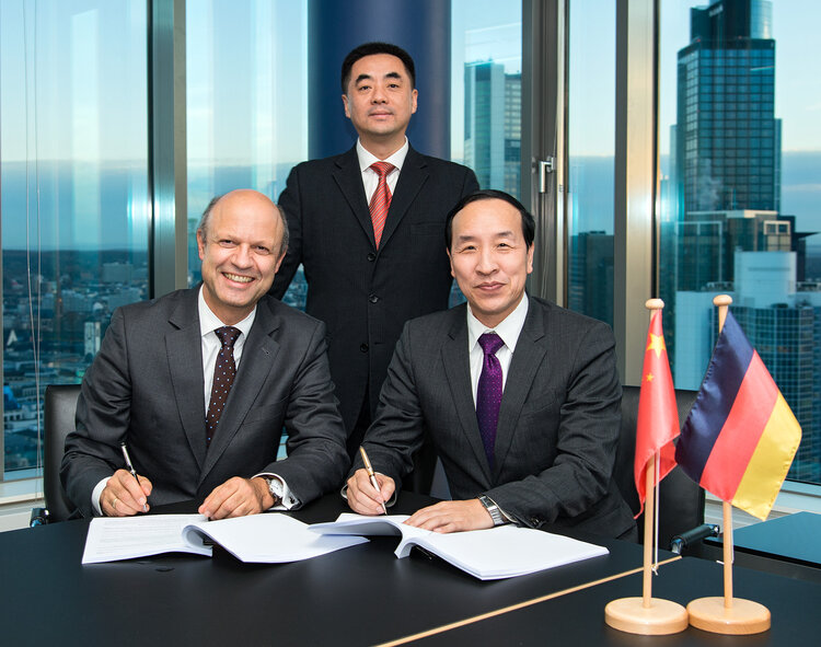 The Chinese chemical group National Chemical Corporation (ChemChina) acquires the KraussMaffei Group. In the picture (from left): Former KraussMaffei CEO Frank Stieler, Chen Junwei, former CEO of ChemChina Finance Co. LTD, Cai Ting, former Chairman and General Manager of China National Chemical Equipment Co., LTD